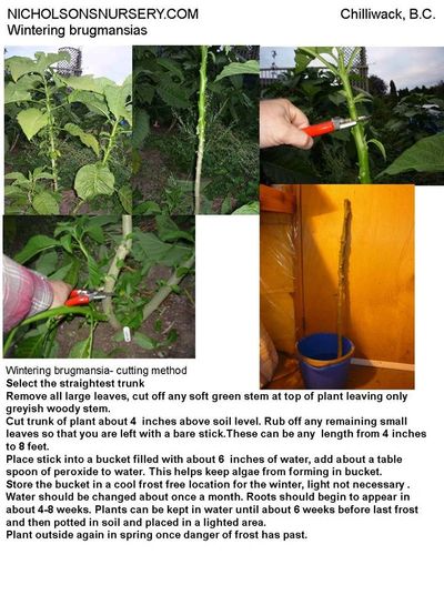 Another way of storing that we've used in the past that I found on the BGI website years ago was often referred to as the "bucket o brugs" method. This is a great way of storing a large number of brugmansia if space is limited. The picture on the top right of this page is a handout we used to give out at farmer's markets. This one can be a bit terrifying for first timers but it works well! Simply cut your brugmansia up into large woody logs any where from a couple of feet to as long as you want to, we've done eight footers in the past with good results. Make sure you only use hardwood cuttings for this, nothing green as they tend to rot over the winter. Strip down to a bare log, no leaves, flowers or buds. Place them in a good sized bucket with about 4 inches of water and a few drops of peroxide to help keep fungus at bay.. Place in a cool place in the house and forget about them for a week. Change the water every week for the first couple of months and after that you can usually cut back to every second week. Keep an eye out for rotting logs and dispose of any that show signs. Smelly water means you have a problem and you'll probably find a rotting stem in the bucket. Normally roots will start within a couple of weeks to a month and will soon fill the bucket. Springtime simply take them out of the water and pot them up.